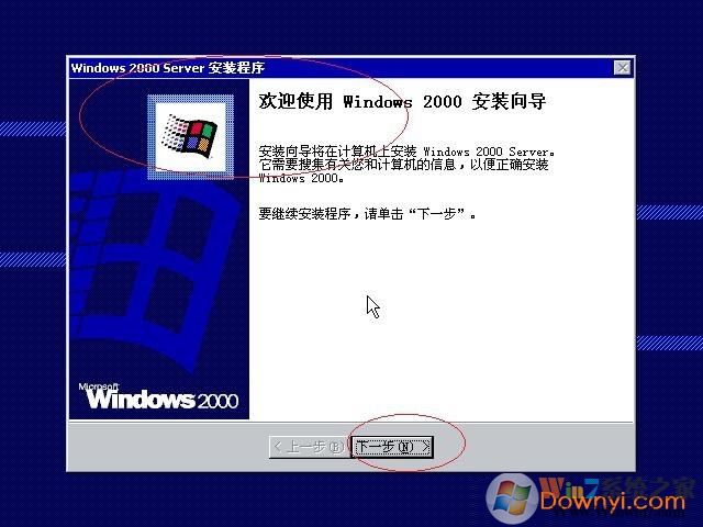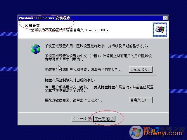 第四步 如圖所示,彈出"歡迎使用windows 2000安裝向?qū)?quot;界面。完成系統(tǒng)區(qū)域和用戶區(qū)域設(shè)置,點(diǎn)擊"下一步"按鈕。