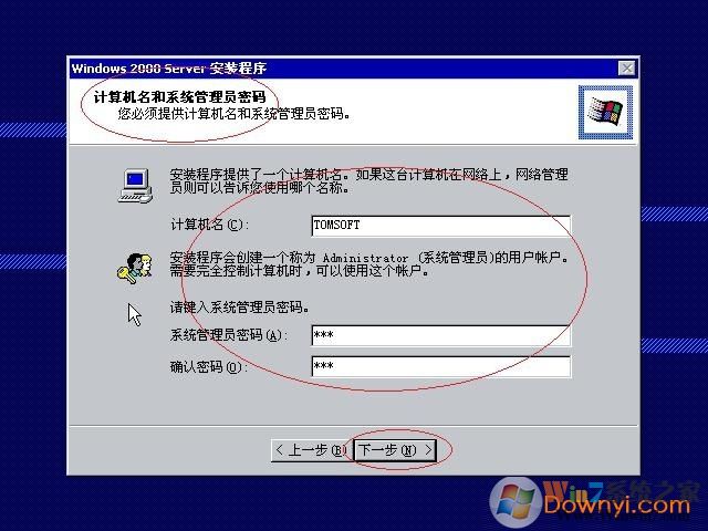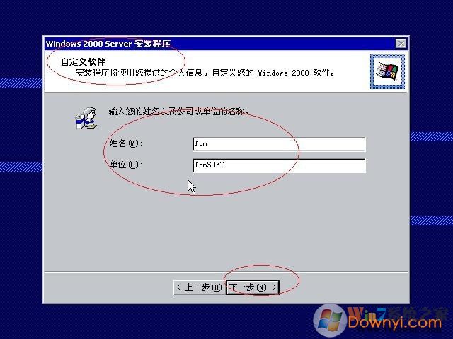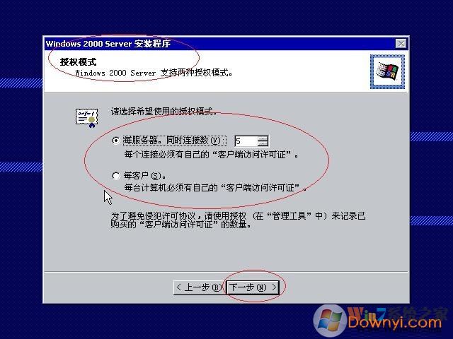 第五步 輸入姓名和單位,如圖所示。選擇windows 2000 server授權(quán)模式,設(shè)置計(jì)算機(jī)名和管理員密碼。