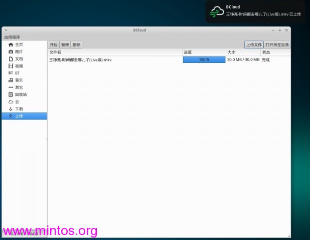 Bcloud 上傳速度很快,上傳完畢會有消息提示。這個消息提示也做的挺漂亮的。