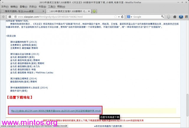 最后測試一下 Bcloud 的離線下載功能。打開一個可下載電影的網(wǎng)站。國內多數(shù)下載網(wǎng)站基本上只提供迅雷或者快車的下載鏈接,Linux 只能空嘆。要么轉到 Windows 下,要么使用虛擬機 Windows,或者 wine 迅雷。
