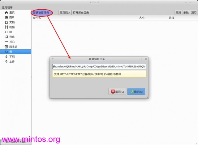 復制剛才網(wǎng)頁中的那個迅雷下載鏈接,在 Bcloud 的“云”標簽中“新建鏈接任務”,粘貼地址。Bcloud 支持多種以前讓 Linux 用戶頭疼的地址格式,超贊!