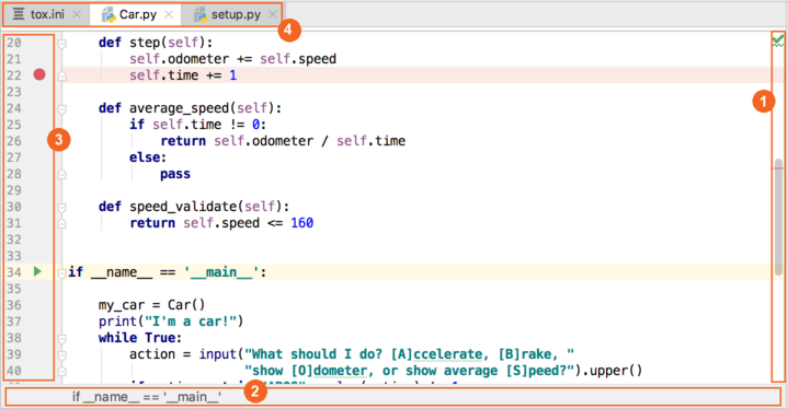 滾動(dòng)條顯示當(dāng)前文件中的錯(cuò)誤和警告。面包屑有助于瀏覽當(dāng)前文件的代碼。