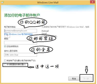 2、添加你的QQ郵箱帳號密碼,全名,勾選手動配置服務(wù)器設(shè)置,下一步;