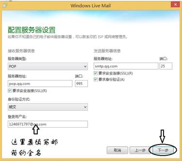 3、同樣按照圖片上填寫的信息內(nèi)容填寫,QQ發(fā)送服務(wù)器smtp.qq.com 接收服務(wù)器pop.qq.com。點下一步。