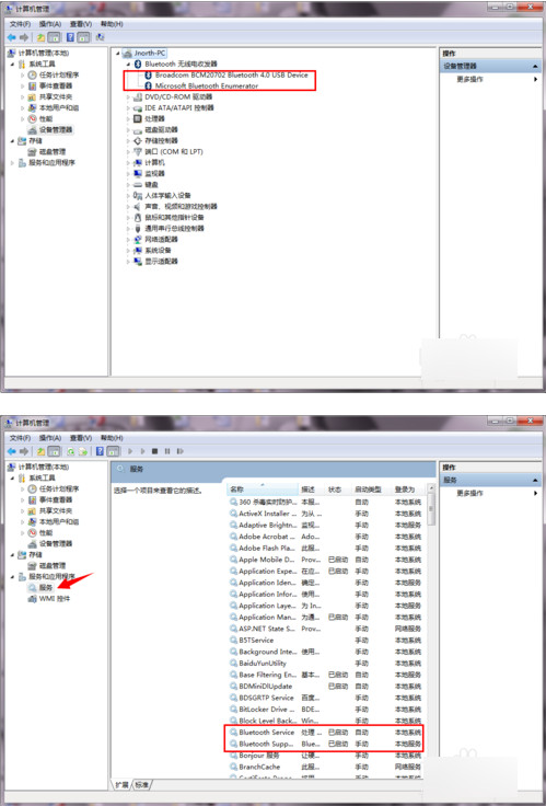 安裝后在桌面計(jì)算機(jī)圖標(biāo)上面右鍵點(diǎn)擊管理,查看設(shè)備管理器里檢查這個(gè)設(shè)備是不是正常的,一般安裝后有兩項(xiàng),如下圖示;其次在服務(wù)和應(yīng)用程序中雙擊服務(wù)打開(kāi),查看兩項(xiàng)服務(wù)一定要啟動(dòng)。如上兩項(xiàng)全部檢測(cè)完畢,就可以開(kāi)始體驗(yàn)藍(lán)牙服務(wù)了。