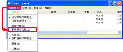 3. 在“打印機”菜單中,單擊“取消所有文檔”(在 Windows Vista / XP / 2000 中)或者“清除打印文檔”(在 Windows ME / 98 中)。
