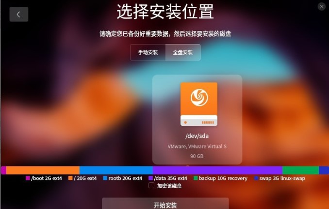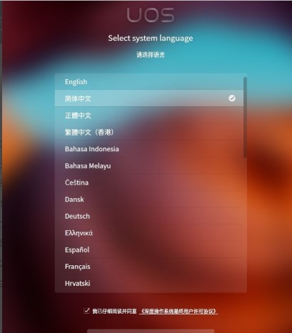 1.安裝UOS的硬盤(pán)要求至少需要64G,若果是在虛擬機(jī)中的安裝體驗(yàn),需要?jiǎng)澐?4G的虛擬硬盤(pán)空間,系統(tǒng)安裝建議的空間大小為128G。你可以根據(jù)實(shí)際的情況進(jìn)行劃分。完成相關(guān)的設(shè)置后,將uos安裝文件掛接后開(kāi)機(jī)進(jìn)行安裝,安裝的第一步選擇需要安裝系統(tǒng)的語(yǔ)言。這里選擇【簡(jiǎn)體中文】并勾選同意協(xié)議。點(diǎn)擊【下一步】繼續(xù)安裝。