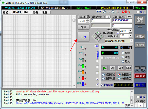 4、選中“數(shù)據(jù)擦除”,代表一旦掃描到硬盤損壞的單元,會對硬盤進(jìn)行擦除操作,由于這個(gè)操作本身有一定風(fēng)險(xiǎn)。所以在確認(rèn)修復(fù)前,最好把電腦上的資料文檔都備份好。