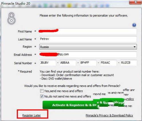 2、解壓安裝包,打開(kāi)后進(jìn)入“Studio”目錄,運(yùn)行“PinnacleStudio.msi”開(kāi)始安裝,將序列號(hào)“JBUBV-ABBAA-BFHFF-FEAAC-RUZCB”復(fù)制入內(nèi),然后點(diǎn)擊Reqister Later。(切記不要直接運(yùn)行“Pinnacle-Studio_20 Installer.exe”安裝,會(huì)序列號(hào)錯(cuò)誤)