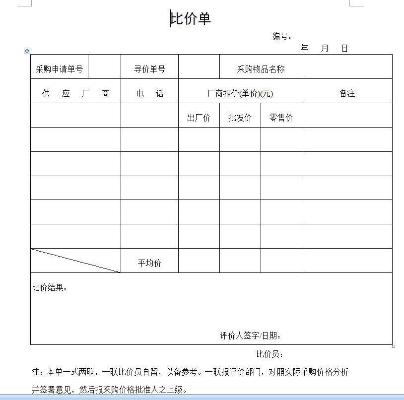比價(jià)單是一款適用于公司采購(gòu)人員使用的對(duì)企業(yè)的一些采購(gòu)商品進(jìn)行的模板,讓你貨幣三家,對(duì)采購(gòu)的商品的進(jìn)價(jià)一目了然。有需要的用戶快通過(guò)下面地址來(lái)獲取這個(gè)比價(jià)單模板吧!