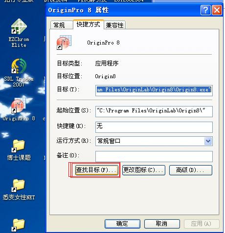 4. 在“桌面”或“程序”中找到Origin8.0的圖標,鼠標右鍵點擊“屬性”,會彈出下圖。點擊下圖中的“查找目標(F)”按鈕,則會進入Origin8的安裝目錄。