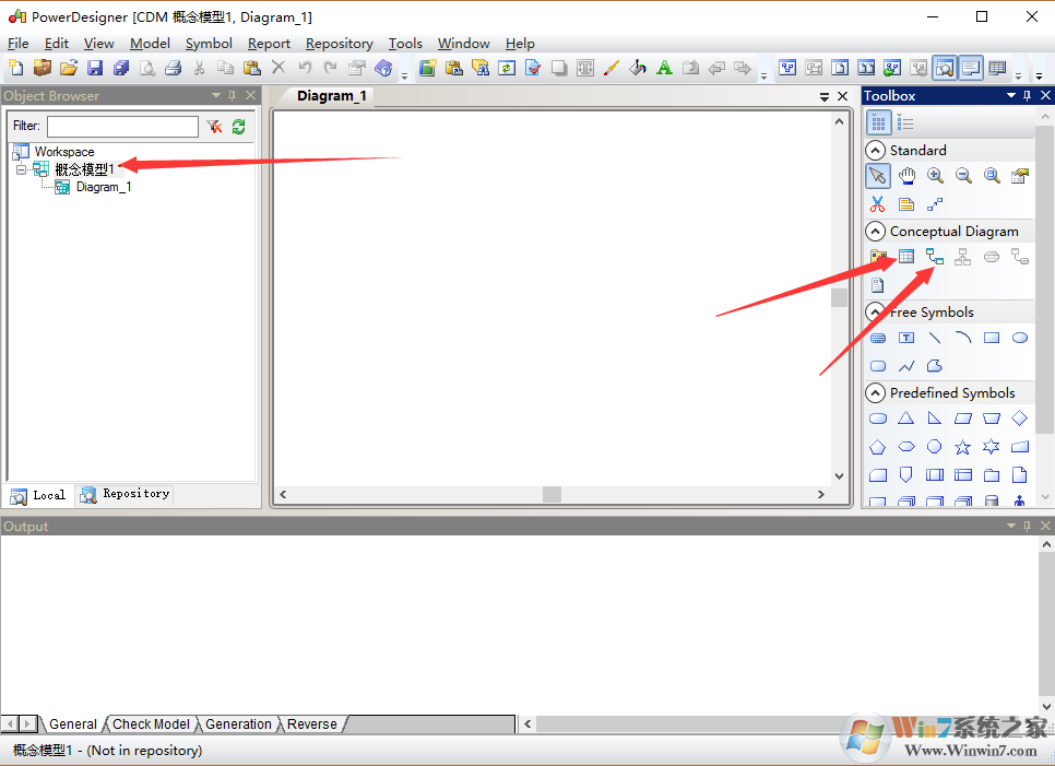 3:點(diǎn)擊上面的ok,即可出現(xiàn)下圖左邊的概念模型1,自己起得概念模型的名字,使用最多的就是如圖所示的那兩個(gè)Entity(實(shí)體),Relationship(關(guān)系)