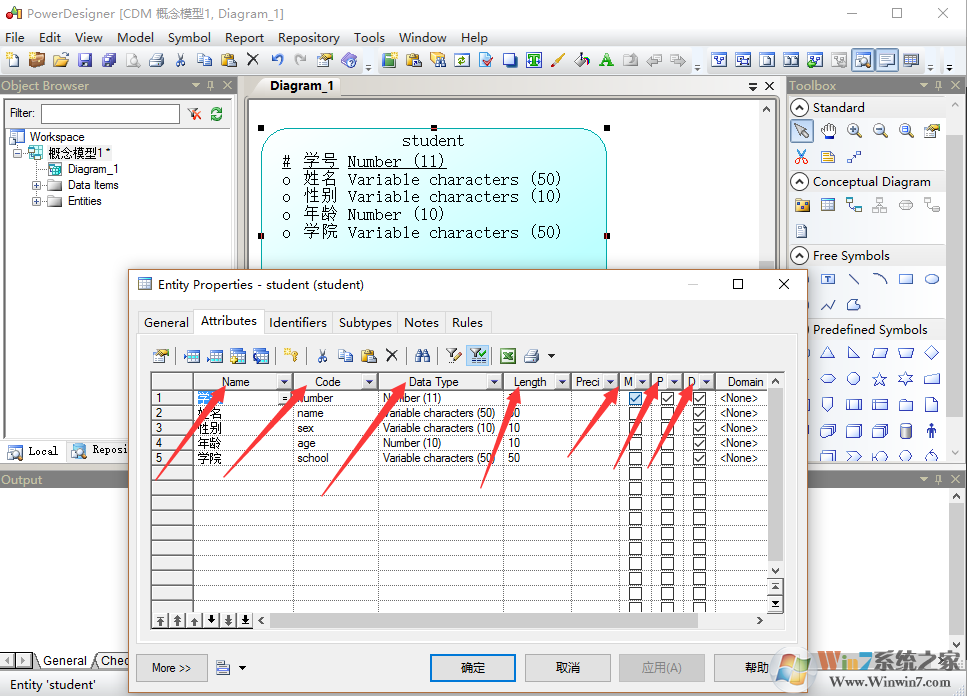 7:創(chuàng)建好概念數(shù)據(jù)模型如圖所示,但是創(chuàng)建好的字體很小,讀者可以按著ctrl鍵同時(shí)滑動(dòng)鼠標(biāo)的可滑動(dòng)按鈕即可放大縮寫(xiě)字體,同時(shí)也可以看到主標(biāo)識(shí)符有一個(gè)*號(hào)的標(biāo)志,同時(shí)也顯示出來(lái)了,name,Data type和length這些可見(jiàn)的屬性