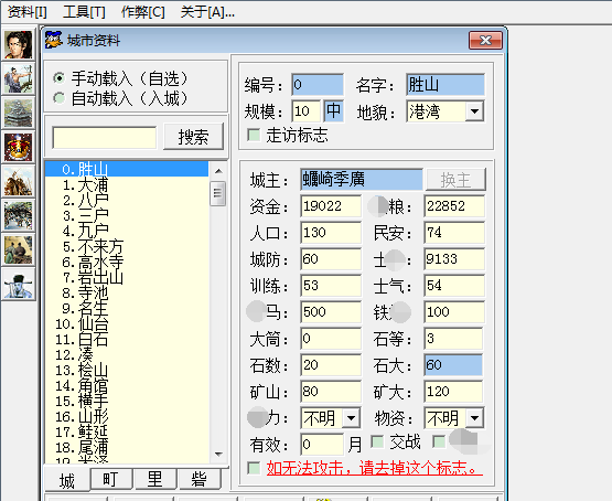 城市,可修改類型和規(guī)模,城主、人口、石頭數(shù)量、礦山、民心、資金、軍糧、防御度、士兵數(shù)量、士氣等。