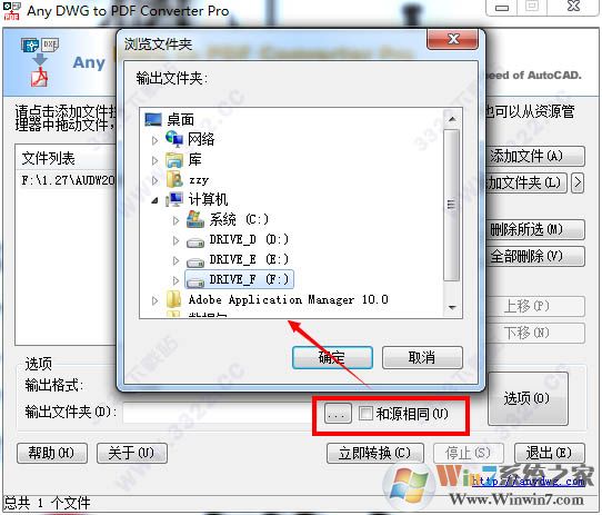 3.點(diǎn)擊“...”設(shè)置輸出文件目錄,當(dāng)然你可以點(diǎn)擊勾選“和原相同”就可實(shí)現(xiàn)輸出路徑和原dwg格式文件路徑一致