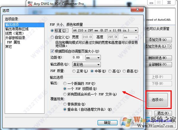 2.點(diǎn)擊“選項(xiàng)”可以進(jìn)行相關(guān)轉(zhuǎn)換設(shè)置,包括“輸出選項(xiàng)”“PDF布局區(qū)域”“PDF參照目錄”“PDF屬性”等