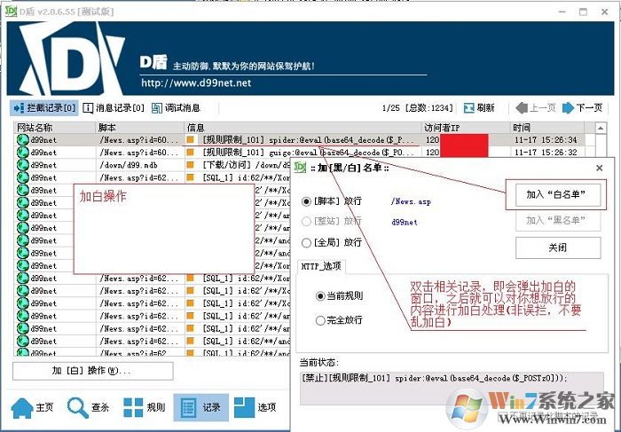 當有誤攔時,請到D盾的"記錄"里查看,雙擊誤攔記錄,會彈出加白的窗口,之后點擊 [加入“白名單”]即可放行。