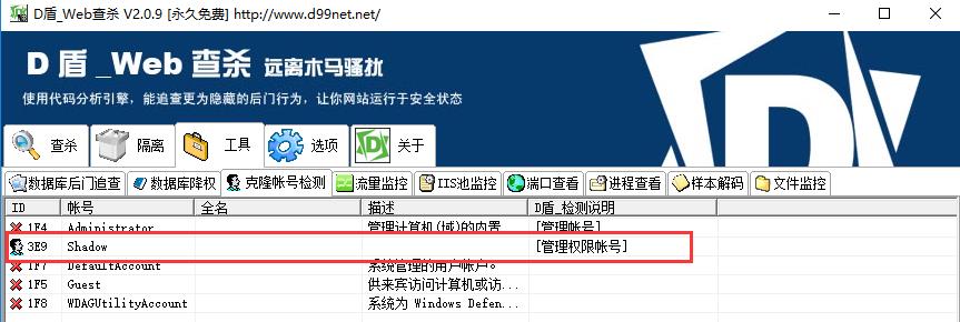點擊【工具】【克隆賬號檢測】可以查看是否被黑客新建了用戶,如下圖: