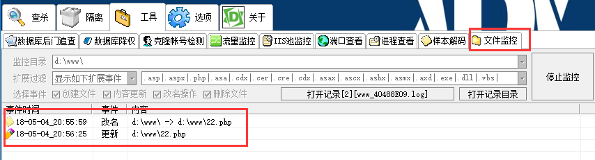 文件監(jiān)控是D盾工具的優(yōu)勢功能,一般的webshell查殺工具不會有,他可以監(jiān)控目錄下文件的變化情況,這種場景在暫時沒有日志或者是暫時沒有發(fā)現(xiàn)黑客的web入侵途徑時比較有用,操作也比較簡單。