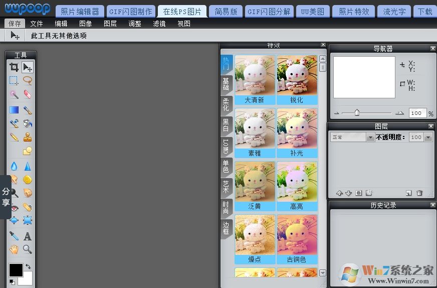 uupoop是一個專業(yè)精簡的在線PS圖片照片制作處理軟件工具,讓你不用安裝PS就可以在線使用它,軟件功能非常的強大,堪稱PS在線版,支持用戶快速地進行圖片編輯、圖片美化以及GIF動畫圖像制作,還能對照片的色彩、亮度、對比度、色溫、色階、色調(diào)、背景、大小、邊框以及效果等進行編輯設(shè)置,就算是新手也能使用!