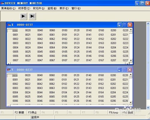 傳送完畢點擊模擬窗口的“寄電器內(nèi)存監(jiān)視”然后從彈出的對話框選擇軟元件“X”和“Y”,這時我們看到的是所有輸入和輸出軟元件的仿真按鈕。