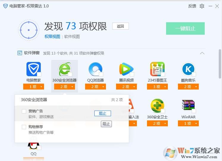 4、接下來我們可以看到每個軟件的狀態(tài),在軟件彈窗一項,對軟件進行管理,把不需要的東西給阻止了。