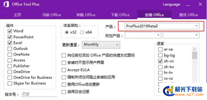 選擇好后點擊開始下載按鈕即可下載Office 2019的安裝包,安裝請在產品ID處手動填寫ProPlus2019Retail。
