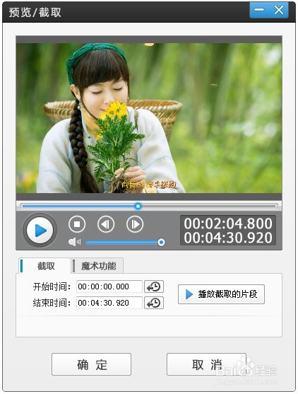 軟件支持一鍵去掉片頭視頻, 我們先在“視頻”面板點(diǎn)擊“添加視頻”按鈕,導(dǎo)入你的視頻。接著進(jìn)入“預(yù)覽/截取”對(duì)話框。在該對(duì)話框“截取的開(kāi)始時(shí)間”和“截取的結(jié)束時(shí)間”處手工輸入時(shí)間點(diǎn),或通過(guò)帶左箭頭的拾取小按鈕設(shè)置截取視頻段,將你需要的視頻片段截取下來(lái),這樣就可以去掉片頭視頻了!