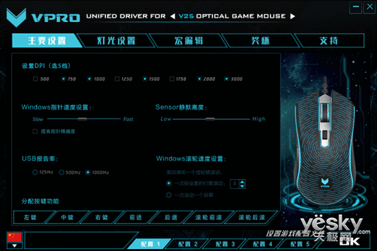 主要設(shè)置頁(yè)面中,可選五擋DPI,最高DPI為3000,同時(shí)還有指針?biāo)俣?、靜默高度、USB報(bào)告率、滾輪速度均可以自行調(diào)整。
