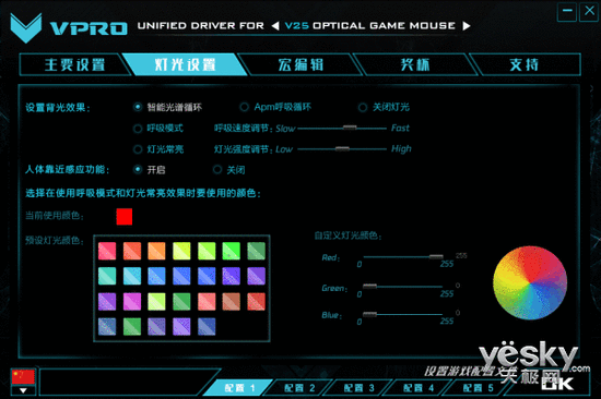 燈光設(shè)置頁(yè)面中,用戶可以控制距離感應(yīng)功能的開(kāi)關(guān),背光效果和顏色、呼吸燈的呼吸速度以及燈光亮度調(diào)節(jié)。
