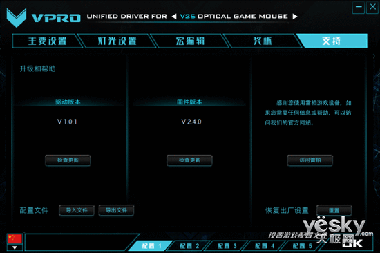 支持頁(yè)面中,驅(qū)動(dòng)版本及固件版本的檢查更新,并設(shè)有恢復(fù)出廠設(shè)置的重置按鈕。