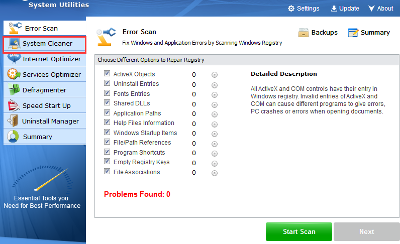 1、軟件左邊有7個功能選項,“error scan”為錯誤掃描,可以幫你檢測并修復系統(tǒng)注冊表錯誤的問題;