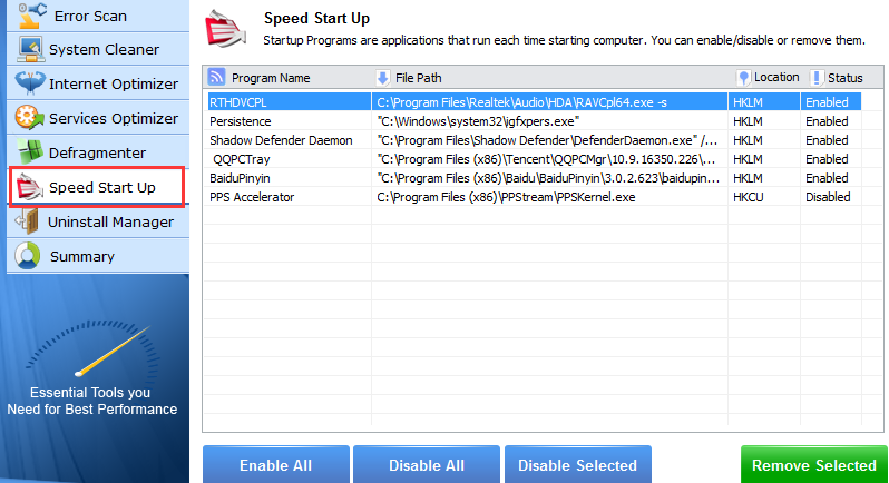 4、“speed start up”為開機啟動,可以選擇電腦開機前的軟件和應用。