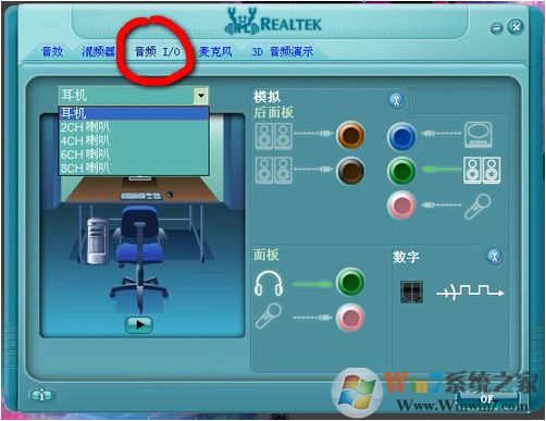 4、在“音頻I/O”標(biāo)簽頁中。先選擇聲音輸出設(shè)備,之后會彈出設(shè)備接頭設(shè)置窗口,如果將設(shè)備插入電腦后沒有聲音的話,可以從此處查看。