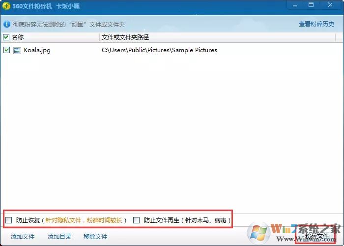 2、點擊“粉碎文件”。在選擇粉碎前還可以勾選防止恢復(針對隱私文件,粉碎時間較長)、防止文件再生(針對木馬、病毒),勾選后粉碎更徹底,不會恢復不會再生。