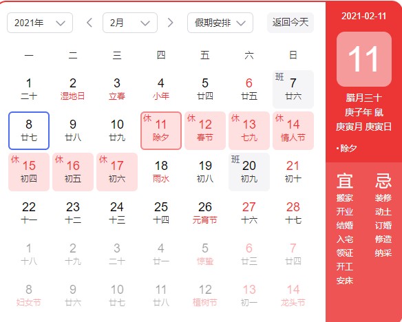 2021年春節(jié)是2月12號,星期五 (辛丑年(牛年)正月初一。春節(jié)的放假安排是2月11日至17日放假調休,共7天。2月7日(星期日)、2月20日(星期六)上班,共7天。