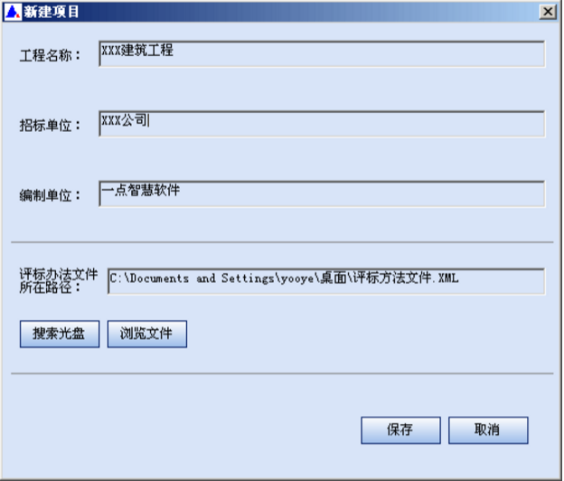 單擊【工程】菜單下的【新建標(biāo)書】,或者點擊工具欄中的【新建標(biāo)書】按鈕,軟件會彈出新建項目界面。在界面中手工輸入工程名稱和招標(biāo)單位,編制單位由軟件自動從加密狗中讀取,通過【瀏覽文件】按鈕選擇評標(biāo)辦法,或者點擊【搜索光盤】由軟件自動從光盤中讀取評標(biāo)辦法,最后點擊【保存】按鈕。