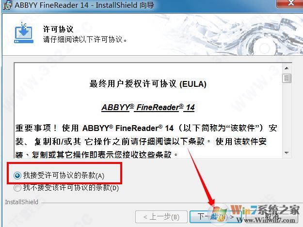 2、選擇“接受”許可協(xié)議條款,進入“下一步”,如圖: