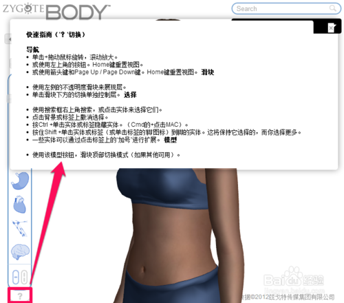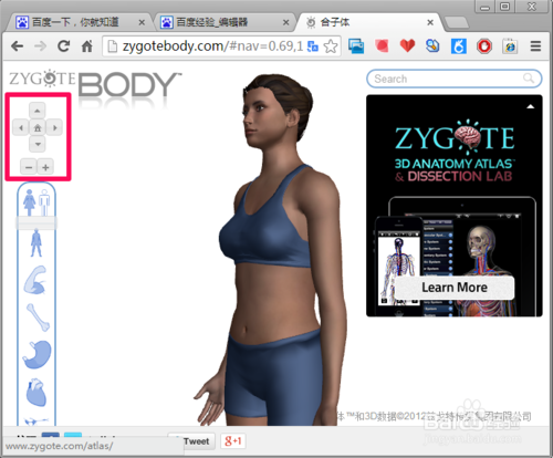 谷歌人體瀏覽器視圖操作很簡(jiǎn)單,除了點(diǎn)擊左上角的按鈕進(jìn)行上下、旋轉(zhuǎn)、擴(kuò)大縮小以外,可以用按住鼠標(biāo)對(duì)模型進(jìn)行旋轉(zhuǎn)拖動(dòng),使用鼠標(biāo)滾輪便可以對(duì)模型進(jìn)行擴(kuò)大縮小,如果想回到初始狀態(tài)點(diǎn)擊中間的房子就可以了。