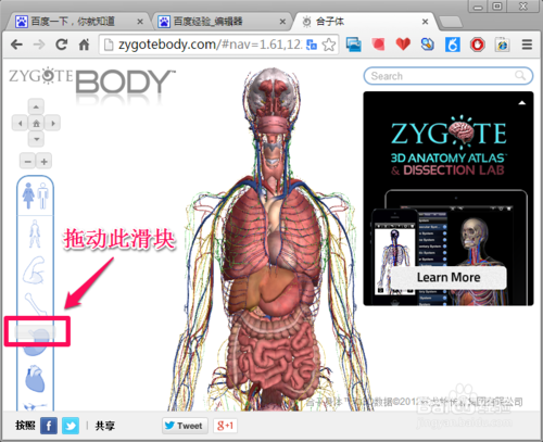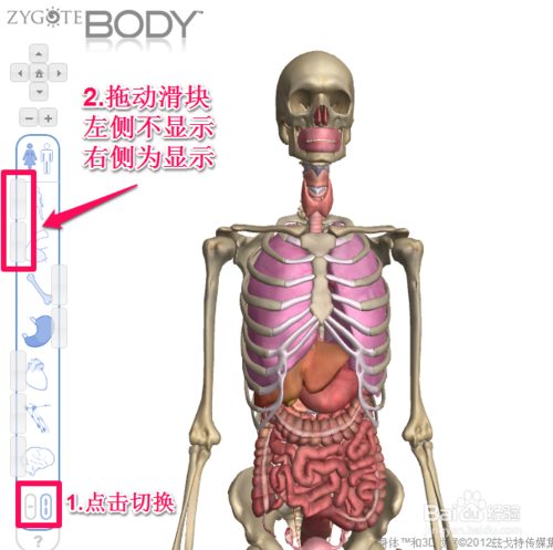 谷歌人體瀏覽器高級(jí)顯示技巧就是點(diǎn)擊下方切換控制,此時(shí)左側(cè)的人體構(gòu)造可以理解為圖層,將滑塊拖動(dòng)到左邊便不顯示,拖動(dòng)到右側(cè)便逐漸顯示,如下圖所示: