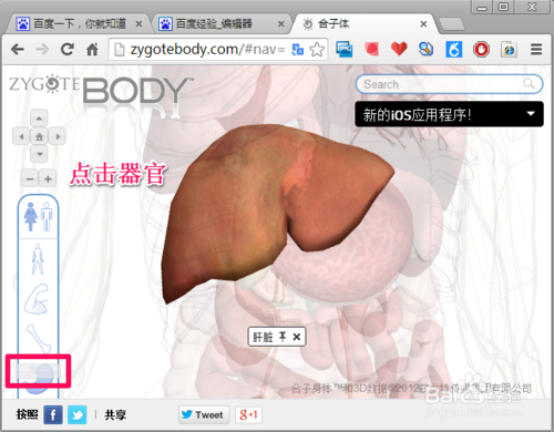 在左側(cè)拖動(dòng)滑塊控制人體結(jié)構(gòu)顯示,在界面中點(diǎn)擊人體的某一器官,此時(shí)其它部位便會(huì)虛化,選中的器官會(huì)單獨(dú)顯示出來(lái)。