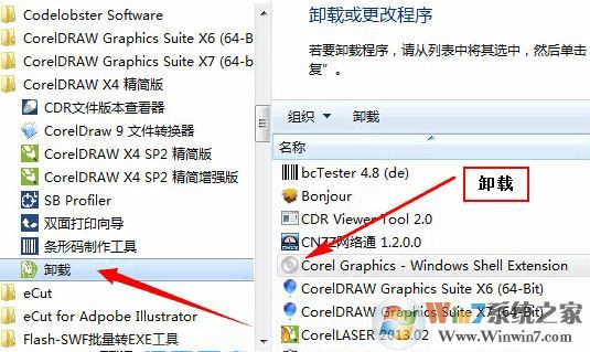 2、從控制面板、程序卸載里找到 Corel Graphics – Windows Shell Extension 然后單獨卸載掉(不影響你的x4程序)。