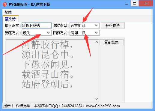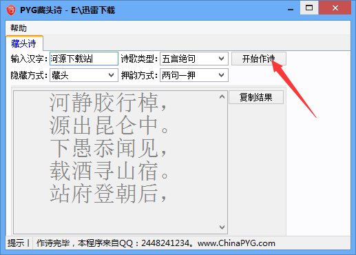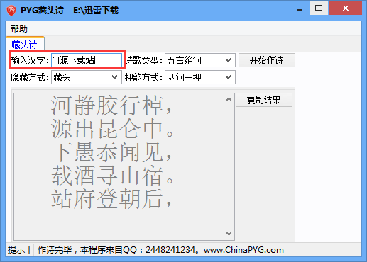 PYG藏頭詩(shī)生成器就是一款能夠快速自動(dòng)生成藏頭詩(shī)的藏頭詩(shī)生成工具!需要將藏的字藏在詩(shī)頭、詩(shī)中和詩(shī)尾,支持生成五言絕句和七言律詩(shī),還可以自動(dòng)有設(shè)置押韻方式,歡迎有需要的用戶來獲取這款PYG藏頭詩(shī)生成器,喜歡的用戶不要錯(cuò)過了哦!