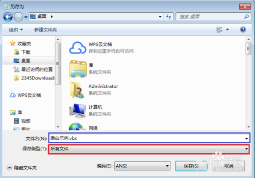 點擊后會彈出以下窗口,文件名改成:表白示例.vbs,保存類型改為:所有文件,然后點擊確定。