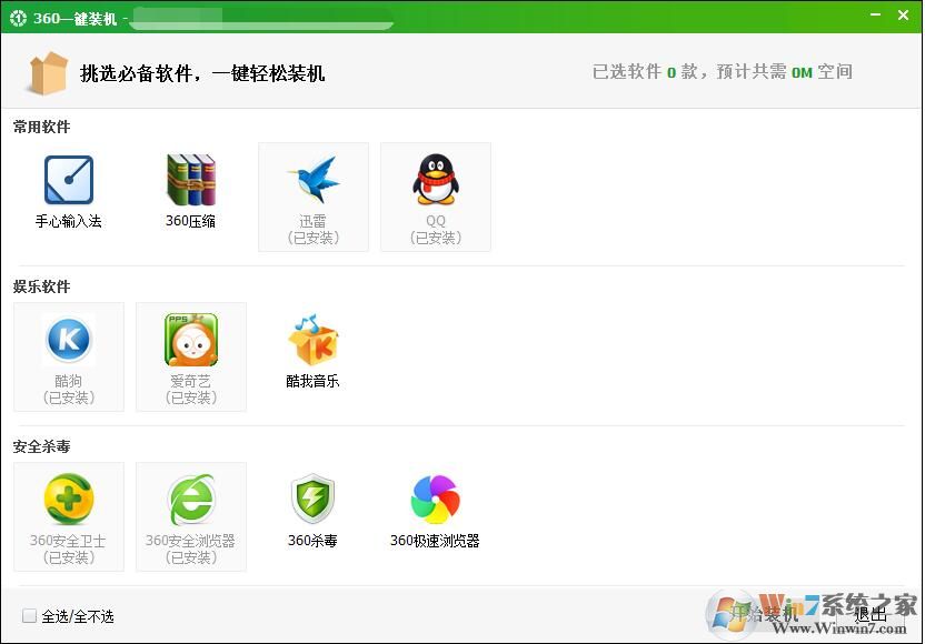 360一鍵裝機(jī)集合包包含360安全軟件+瀏覽器及一些常用的軟件,安裝好系統(tǒng)之后,只要使用360一鍵安裝集合包就可以快速安裝需要的常用軟件,而不必一個(gè)一個(gè)去下載,用戶可以選擇自己需要的軟件勾選后一鍵裝機(jī)即可。