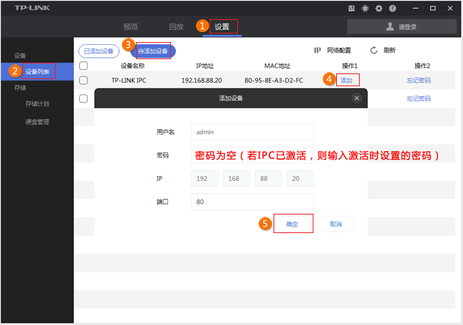 注意:電腦的IP地址必須與攝像頭的IP地址在同一網(wǎng)段才能添加成功。