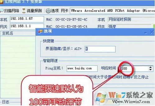 1、首次運(yùn)行幻境網(wǎng)盾會(huì)彈出一個(gè)“選項(xiàng)”設(shè)置窗口,這里可以設(shè)置界面隱藏快捷鍵、智能限速的設(shè)置、ARP防火墻等。智能限速的默認(rèn)響應(yīng)時(shí)間是100ms,對(duì)于懶人或者小菜鳥來說,直接使用默認(rèn)值就可以了。