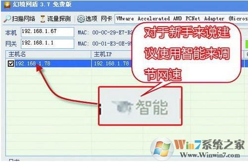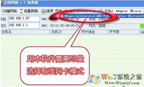 2、在主界面的“網(wǎng)卡”中,選擇接入局域網(wǎng)所用的網(wǎng)卡。如果同時(shí)可以使用無線連接和有線連接,那么建議在“網(wǎng)卡”中選擇有線網(wǎng)卡,而不要使用無線網(wǎng)卡,這點(diǎn)請(qǐng)大家記住了。因?yàn)橐暵酚善鞑煌?,幻境網(wǎng)盾使用無線網(wǎng)卡可能根本無法控制別人的網(wǎng)速。