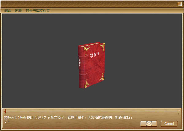 書架相當(dāng)于收藏夾,可以收藏50本書,一般人也就同時看這么多了,再多頭都大了。打開書架拉動下面的滑動條可以劃到任意一本書,其實(shí)也可以直接點(diǎn)其中一本,它會自己跑到中間擺好pos,點(diǎn)住空白處或者中鍵可以任意轉(zhuǎn)動視野,ctrl+滾輪可以縮放大小,按ok就可以打開啦。按鈕旁邊有書的摘要可以幫助你識別,漂亮吧!精裝本的書呢!上面有刪除、刷新等等菜單,添加了一本書后要刷新后才可以看到,不然就還保持著上次看到的那本書。