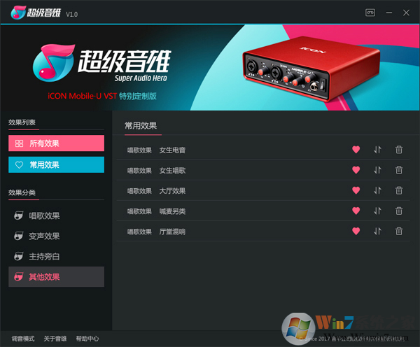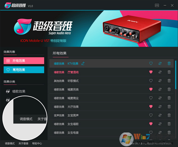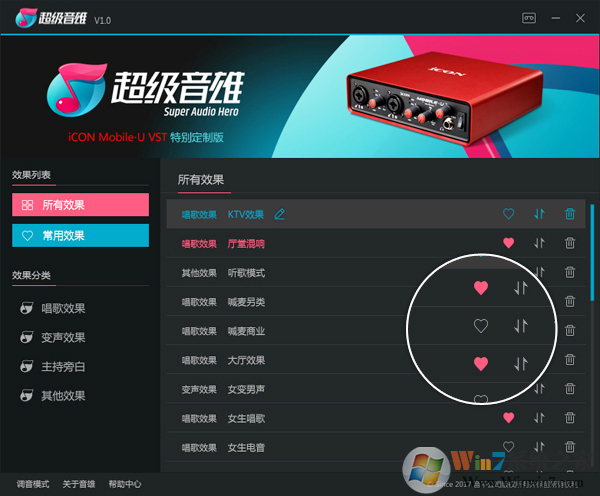 1.打開(kāi)超級(jí)音雄主界面,當(dāng)為簡(jiǎn)易模式時(shí),點(diǎn)亮愛(ài)心時(shí)即為設(shè)置為常用效果,再次點(diǎn)擊愛(ài)心,愛(ài)心為空心時(shí)即為取消設(shè)置為常用效果,如圖